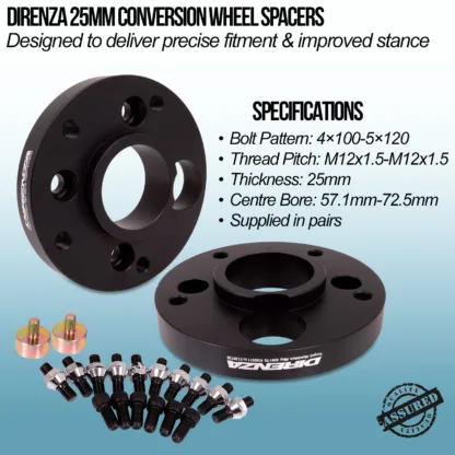 Direnza wheel adapters work very similarly to conventional wheel spacers except they are supplied dual drilled with two or more sets of bolt-holes. While one set matches the OEM hub fitment of your vehicle, the other matches those of your desired wheels.